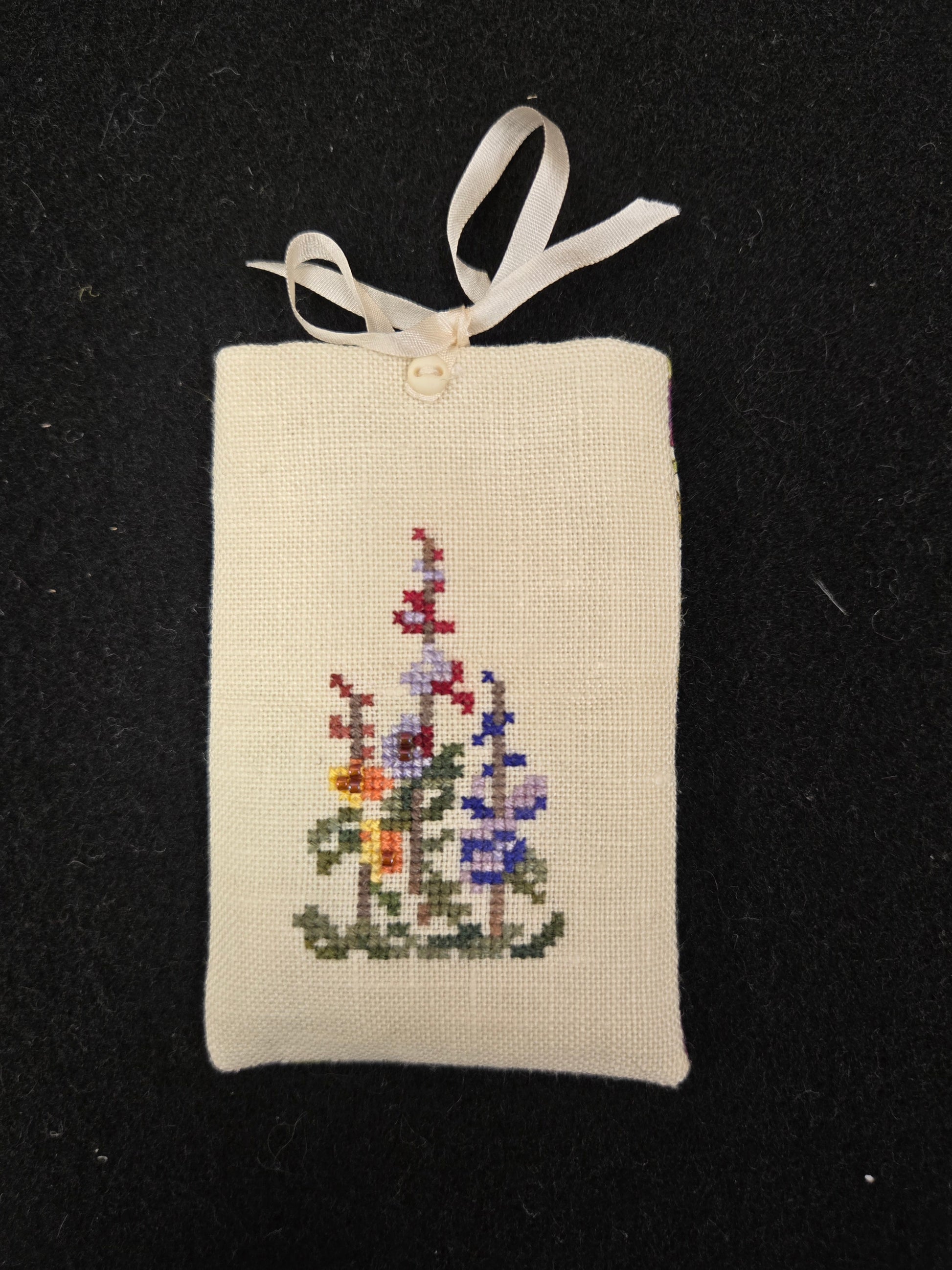 Model of Anna's Garden pocket from The Purple Thread. Approximately 2 x 3.5 inches. Stitched on linen with unknown floss. Could be worn as a small scissor or notion holder.