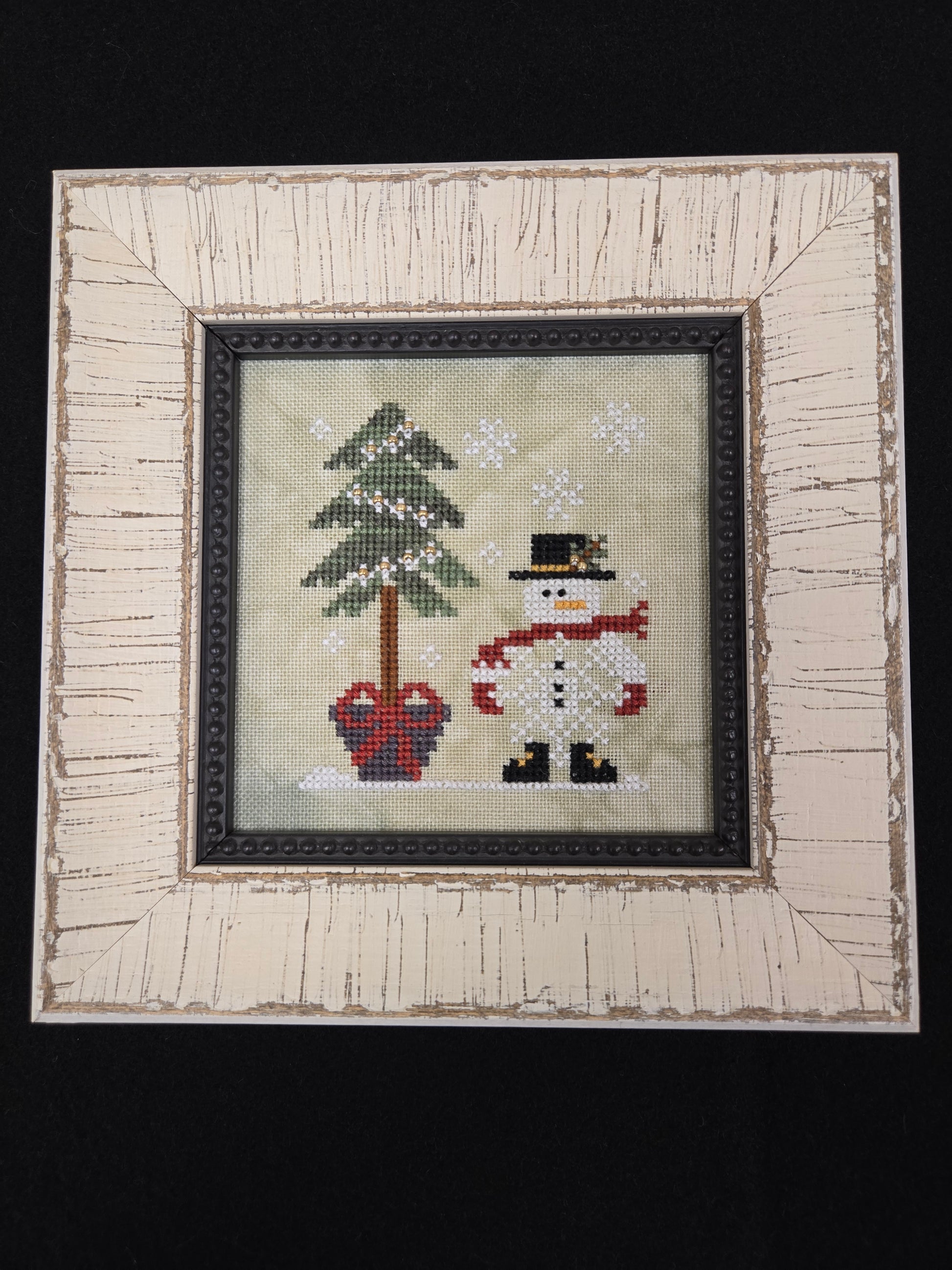 He's a Flake by Little House Needleworks. Framed model. Approximately6.5 x 6.5 inches. Stitched on overdyed linen.